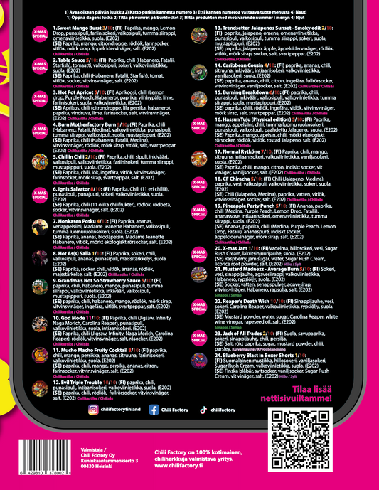 Ready?! Fire! Kick to the face, not forgetting the magical taste. Three strong chili sauces from our chili family and in one bundle. Take a spoon and try! Heat levels 7, 8, 10.