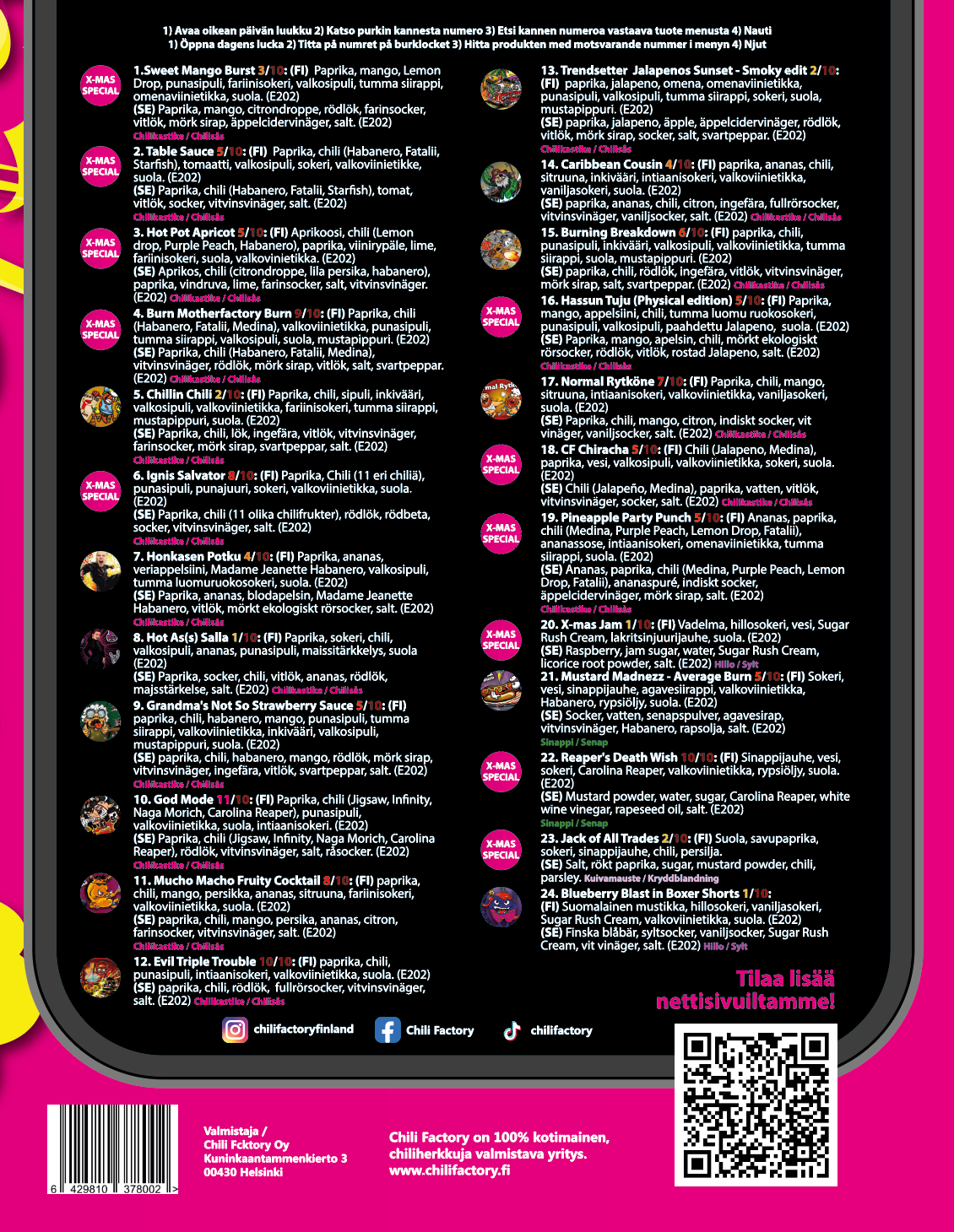 (FI) Paprika, chili (Habanero, Fatalii, Medina), valkoviinietikka, punasipuli, tumma siirappi, valkosipuli, suola, mustapippuri. (E202)